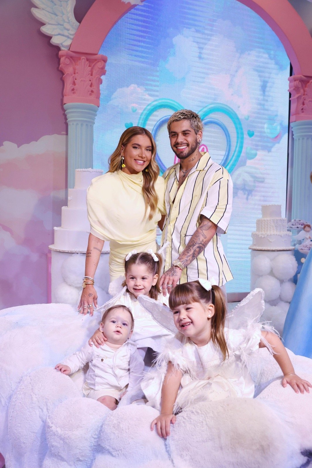 Zé Felipe e Virgínia chegaram acompanhados dos três filhos. A festa, que acontece em Goiânia, conta com mais de 60.000 balões. Foram 10 dias de montagem, envolvendo 200 pessoas.