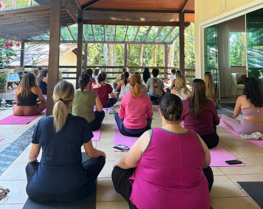 Ao longo de sete horas de programação, as participantes foram conduzidas por uma jornada cuidadosamente estruturada, que combinou yoga, práticas terapêuticas, palestras e experiências sensoriais. Desde a recepção com café leve até o encerramento em roda de partilha, cada momento foi pensado para estimular consciência, escuta interna e troca genuína.